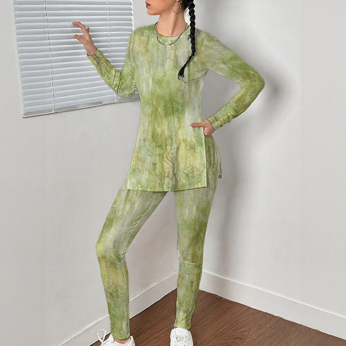 Col rond, manches longues, haut oversize fendu et pantalon confortable